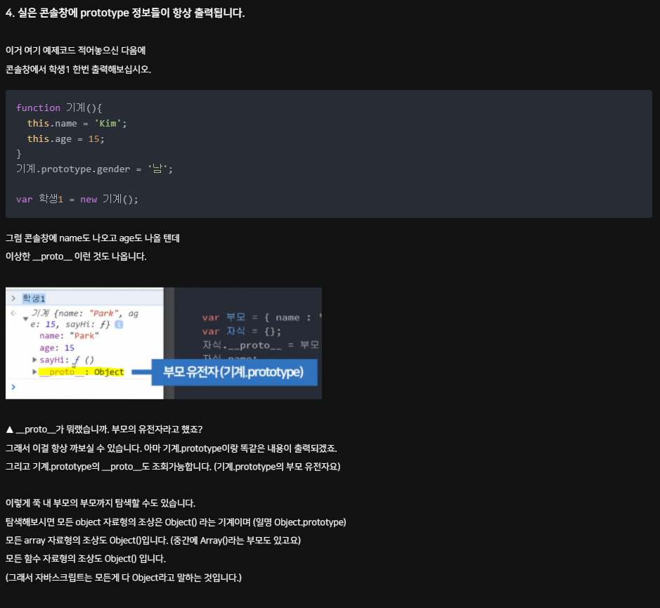 또 생성자로 객체를 만들었을 때 객체명.__proto__는 결국 부모 생성자의 프로토타입을 보여주는것이라 했다.